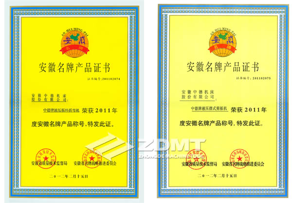 2012年3月22日,马鞍山市召开了全市品质手艺监视任务集会,集会对2011年取得质监部分相干声誉的企业与小我停止了惩处,我公司中德牌液压油泵摆式数控剪板机和中德牌气动板料拆弯机两个产物别离经由过程了2011年“安徽名牌”的复审。